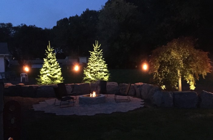 This cozy backyard fire pit area really came together even better than we expected! Patio block is Belgard Mega Arbel. We left the edges rough/natural looking. The fire pit is Techo-Bloc Valencia with the Zentro smoke free insert, which works awesome. Due to grade change with the neighbors, we built an outlining dolomite retaining wall. This wall was backfilled with fresh topsoil to make level to neighbors property and to produce privacy for around the fire pit. Two 8′ Concolor Firs were planted and up-lighted as well as a very large, specimen Japanese Threadleaf Maple. Path lights around base of wall are Unique Lighting Constellations.